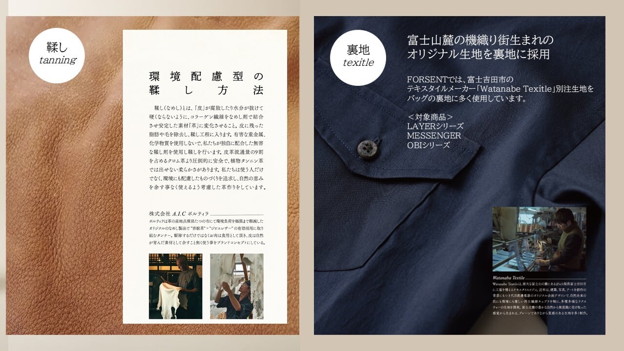 FORESENTでは、これらの課題に取り組むため、駆除された鹿や熊の野生皮革、リサイクル可能な衣類繊維などの資源を商品の主素材として展開するブランドです。