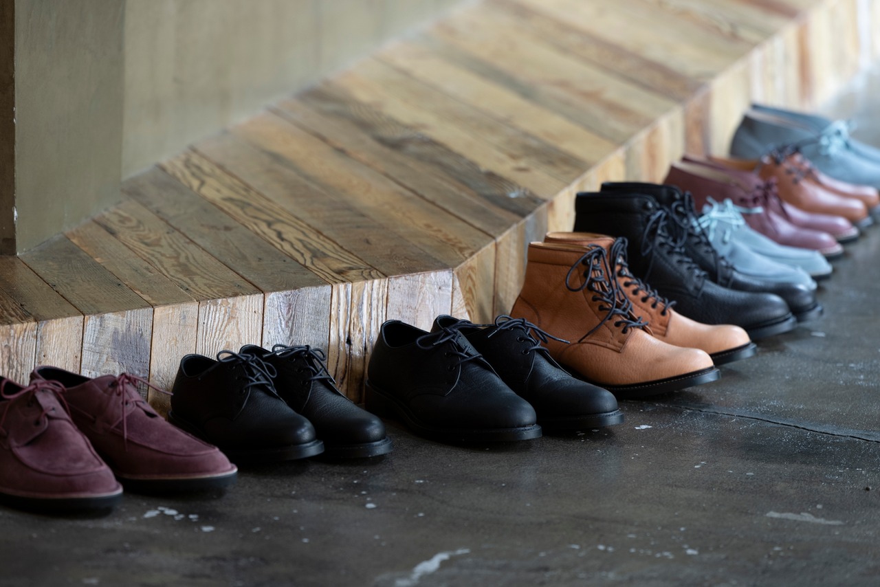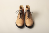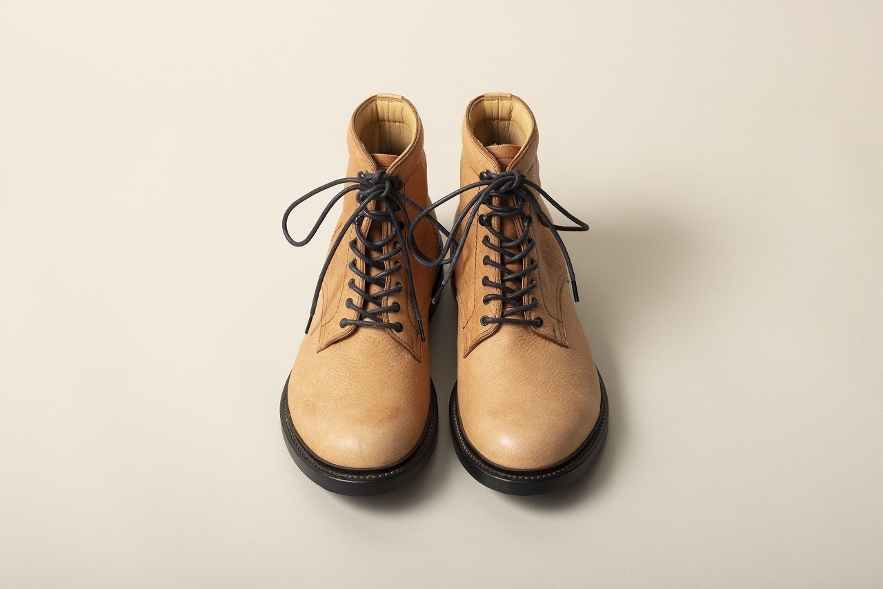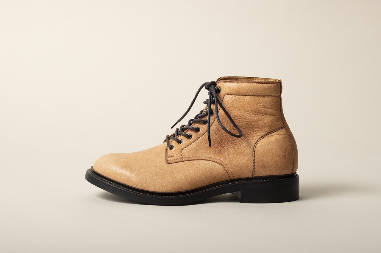 革のレースアップブーツは靴ずれなどを起こしやすい傾向にありますが、鹿革特有のしなやかさと柔らかさがその問題を解消します。また、特有のムラ感と柔らかい風合いがとても魅力的に映えます。手入れをすることで深みや艶のある黒色へと経年変化を楽しむことができます。