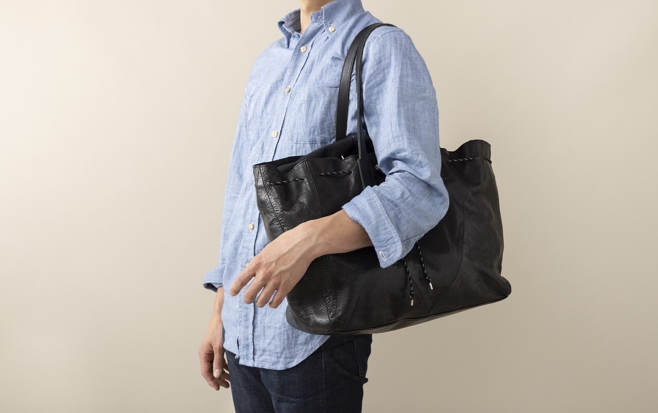 折り紙の「舟」の形を表現したラージサイズのトートバッグをレザー仕様にアレンジ。