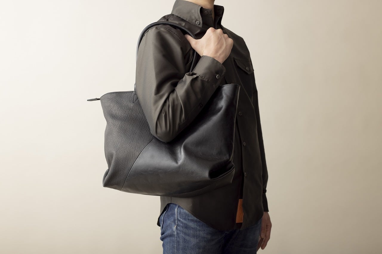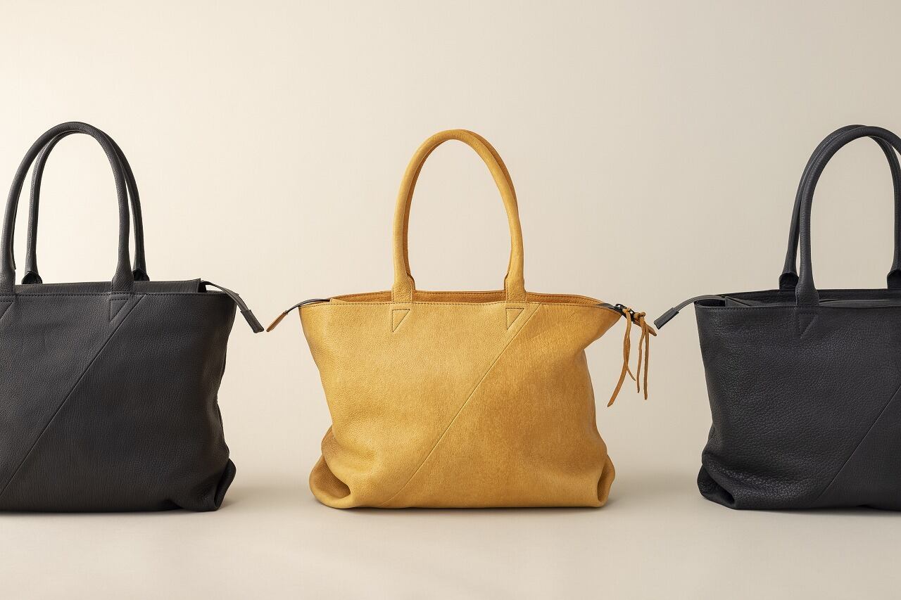 山の重なり(LAYER)を表現した切り替えしが特徴的なレザートートバッグLAYERの鹿革100%使用のタイプ。重くなりがちなレザーバッグですが、斜めに切り替えしたたデザインと